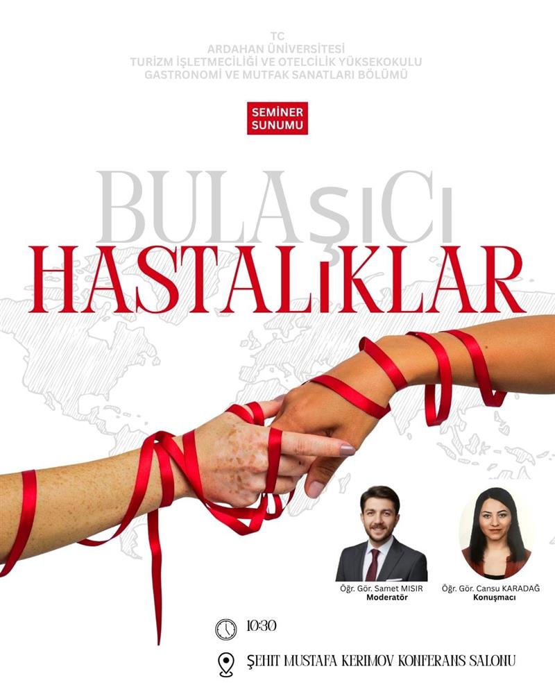 Yüksekokulumuz Gastronomi ve Mutfak Sanatları Bölümü öğrencileri için Teknik Bilimler Meslek Yüksekokulu öğretim elemanlarından Öğr. Gör. Cansu KARADAĞ'ın konuşmacı olduğu Bulaşıcı Hastalıklar Semineri Yüksekokulumuz Gastronomi ve Mutfak Sanatları Bölümü öğretim elemenlarından Öğr. Gör. Samet MISIR'ın moderetörlüğünde 14.04.2026 tarihinde Şehit Mustafa KERİMOV Konferans Salonu'nda gerçekleştirilmiştir.